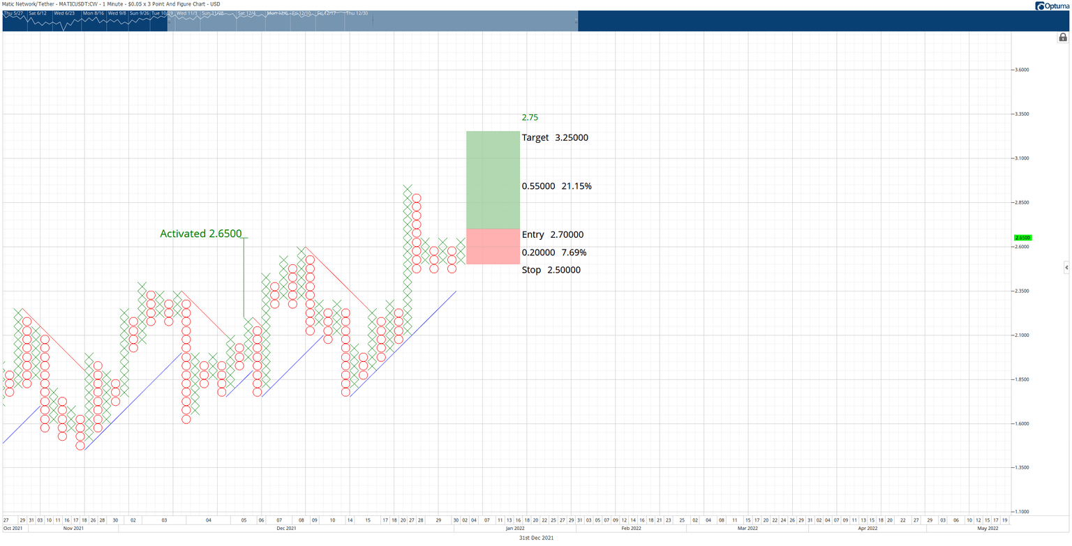 MATIC price has two trade opportunities on its $0.05/3-box Reversal Point and Figure Chart. The first theoretical trade is a buy stop order at $2.70, a stop loss at $2.50, and a profit target at $3.25. The entry is based on a breakout above a triple-top. The trade represents a 2.75:1 reward for the risk setup.