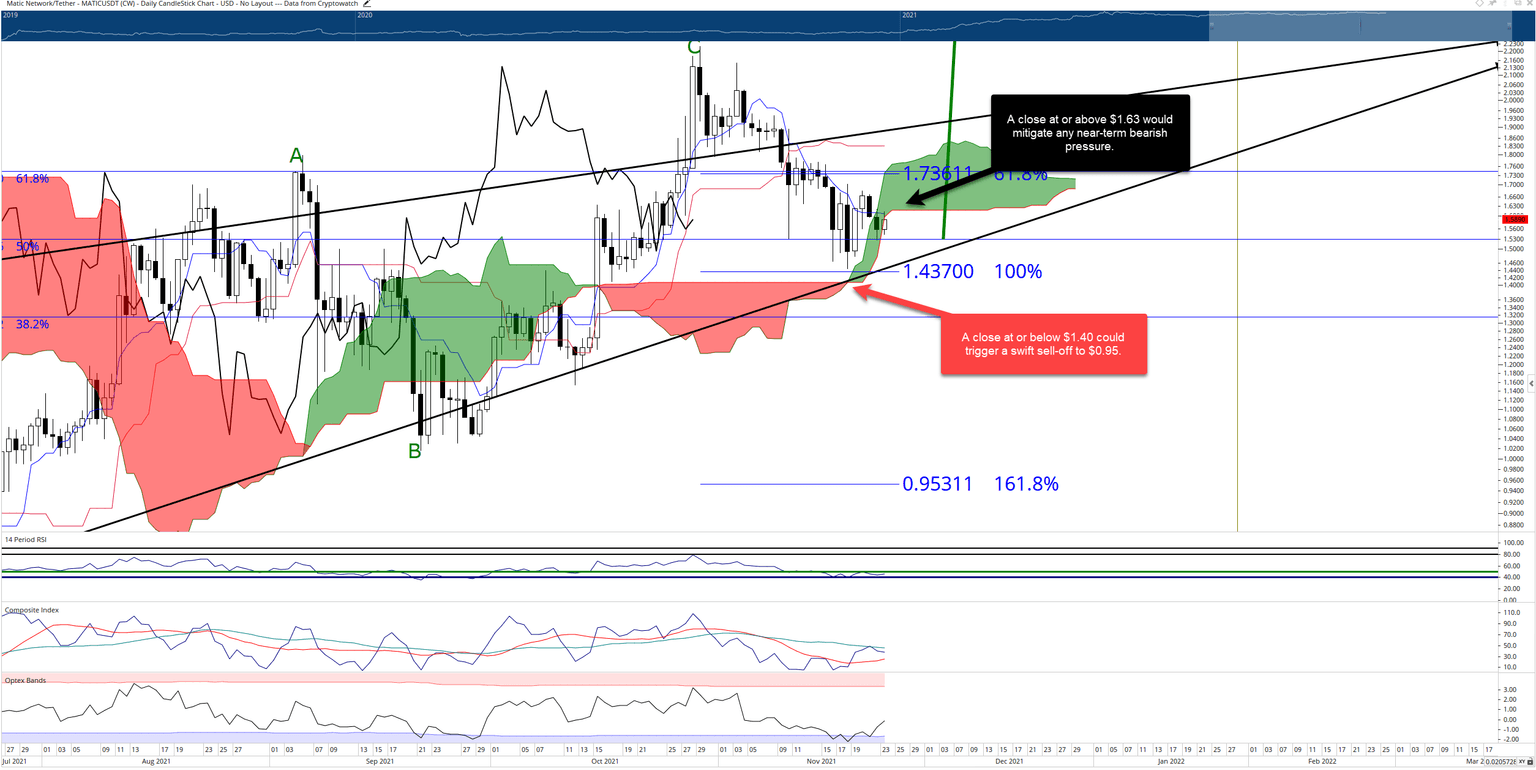The near-term bearish outlook could be mitigated if MATIC price closes above the Tenkan-Sen and Senkou Span B at $1.63. From there, the road to the Point and Figure buy stop entry is more straightforward and more probable.