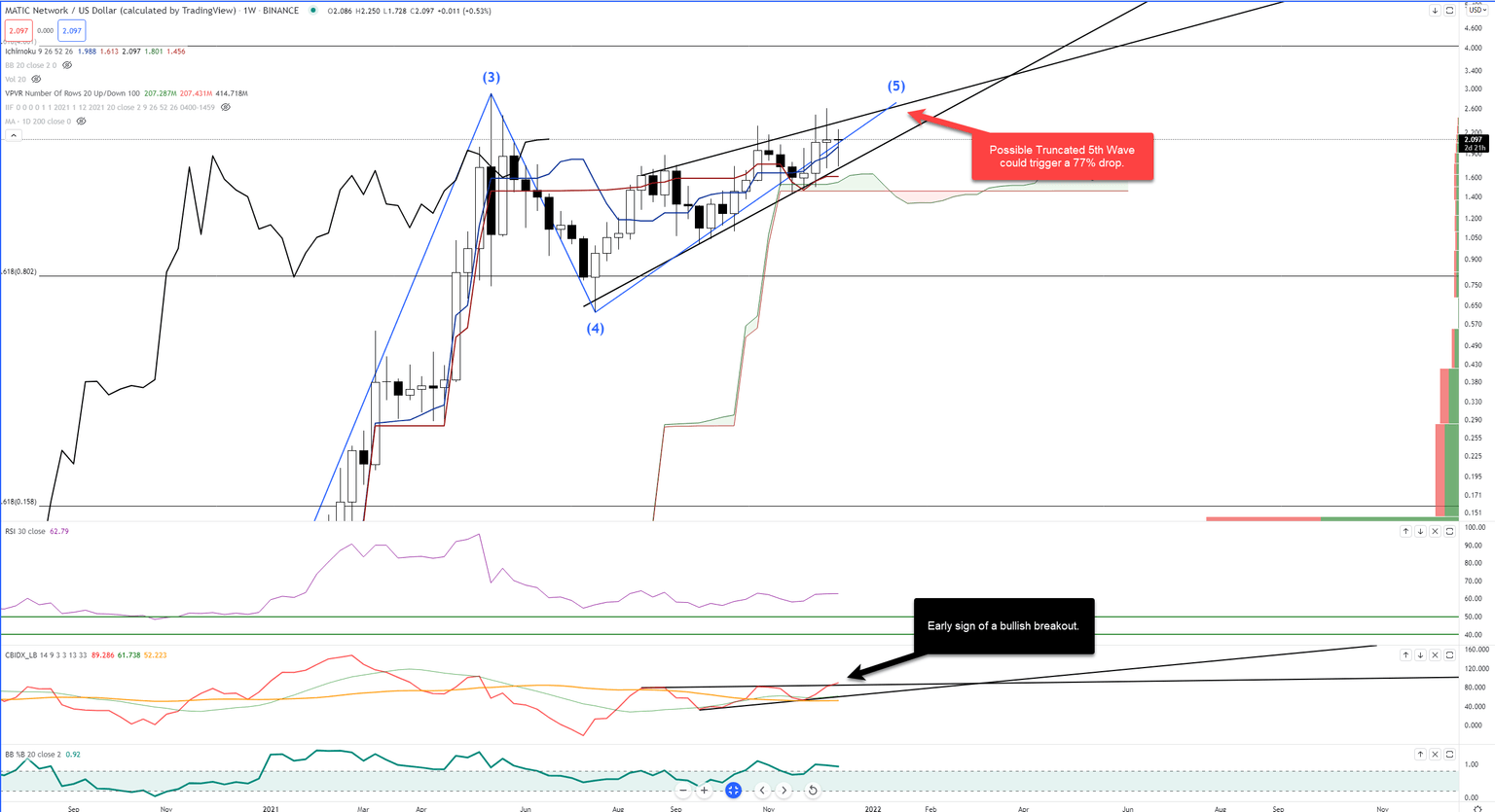 MATIC price action is developing into a fascinating and provoking technical chart. Undoubtedly, the current weekly chart will act as a supreme example by Elliot Wave enthusiasts as either a perfect example of a Truncated 5th Wave or a massive bearish fakeout. Either has yet to be determined.