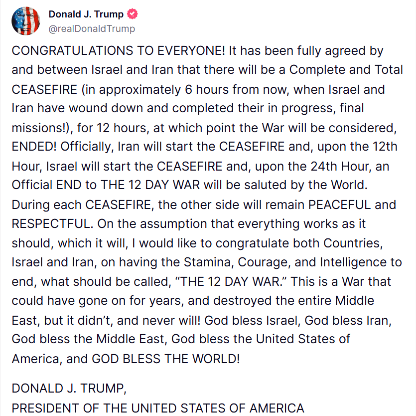 Donald Trump announced late on Monday that a “complete and total” ceasefire between Israel and Iran, pausing the ongoing 12-day war. The announcement led to a sharp recovery in crypto markets, with top meme coins such as DOGE, SHIB, and PEPE rising by more than 8%, 9%, and 11%, respectively, that day. On Tuesday, these meme coins continued to extend their gains.