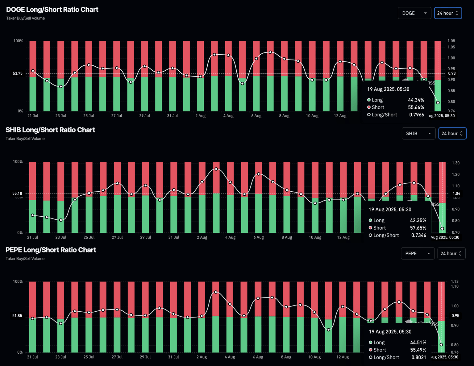 CoinGlass data shows the short positions are on the rise, suggesting a sell-side dominance in the DOGE, SHIB, and PEPE derivatives market. This suggests a spreading risk-off sentiment, as the majority of traders anticipate further losses.