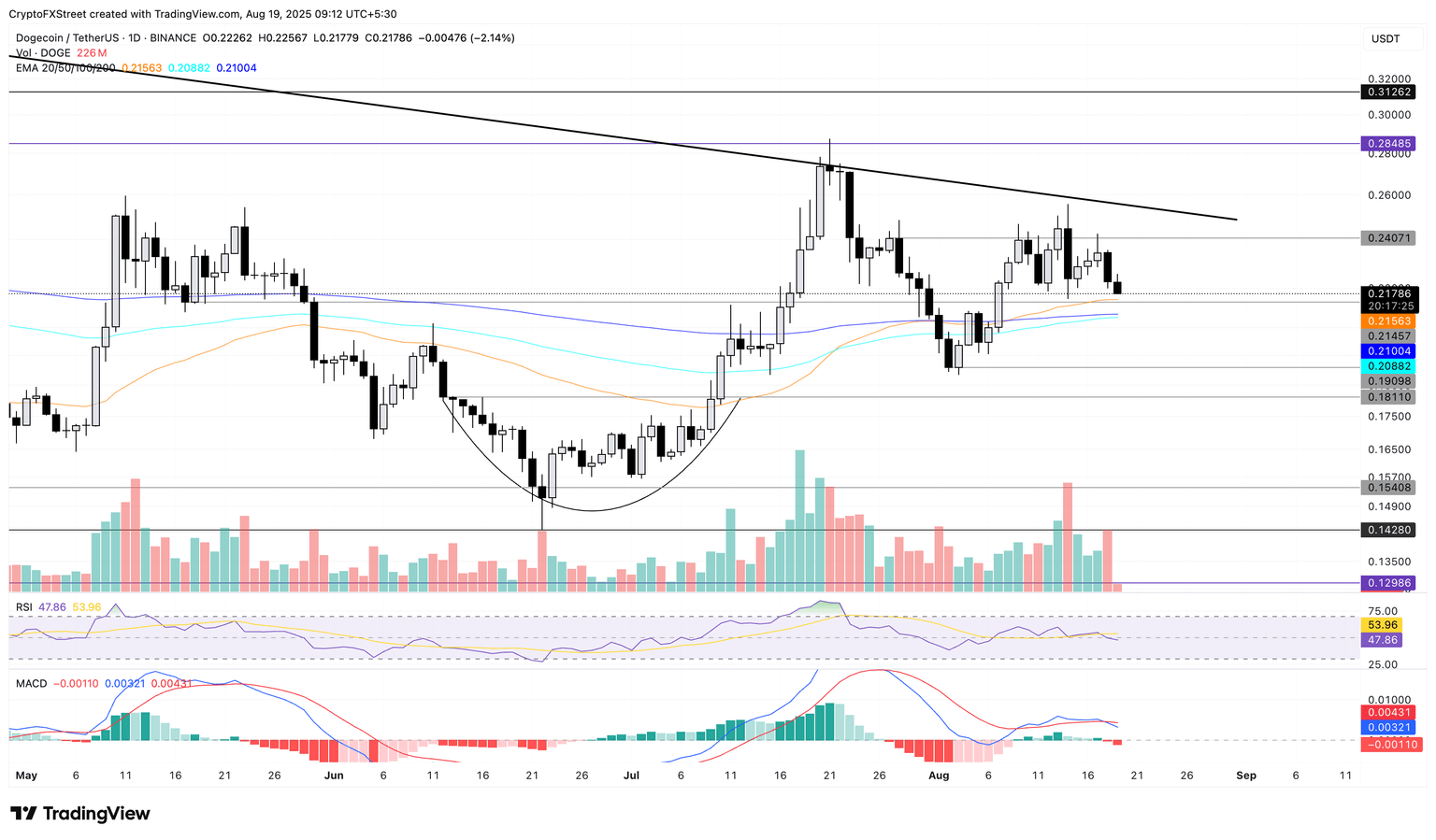 Dogecoin edges lower by 2% at press time on Tuesday, extending the 5% loss from Monday and approaching the 50-day Exponential Moving Average at $0.2163. A decisive push below the 50-day EMA could extend the decline to the 200-day EMA at $0.2100.