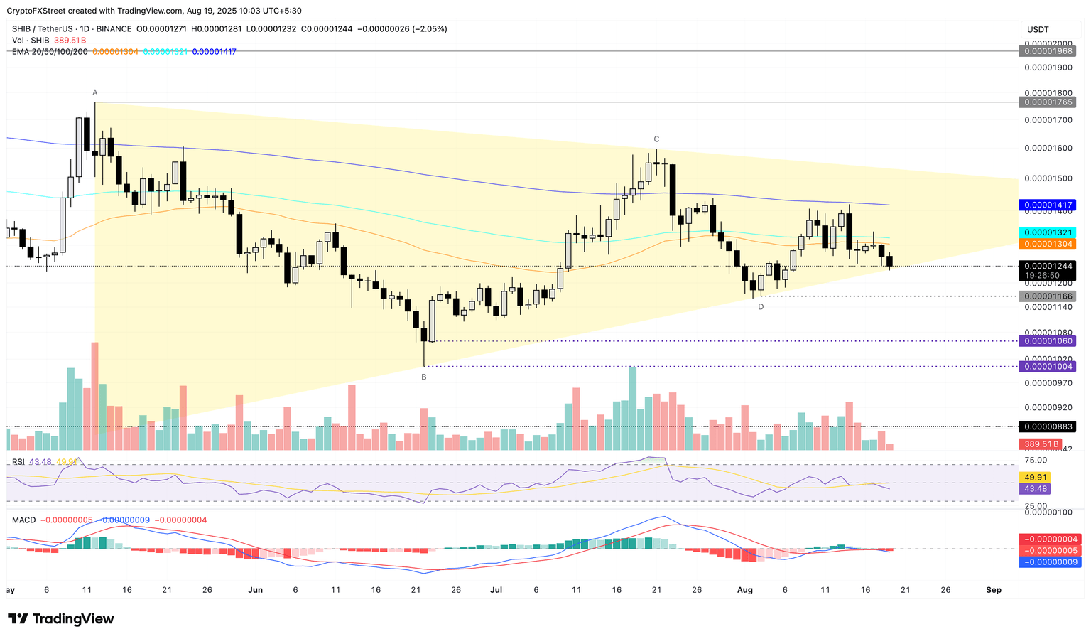 Shiba Inu failed to sustain above the 50-day EMA on Sunday, resulting in a 2.46% drop on Monday. At the time of writing, SHIB edges lower by 2% on Tuesday, risking a breakdown of a symmetrical triangle pattern on the daily chart (shared below).