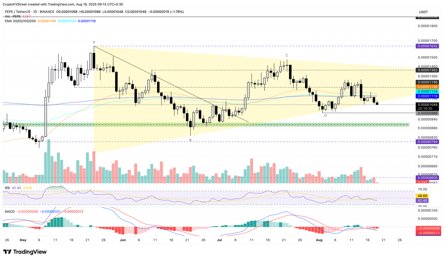 The 50- and 200-day EMA moving close to each other risk a Death Cross as PEPE declines. A crossover would signal a sell opportunity for sidelined traders, aligning with the fallout from the triangle pattern.