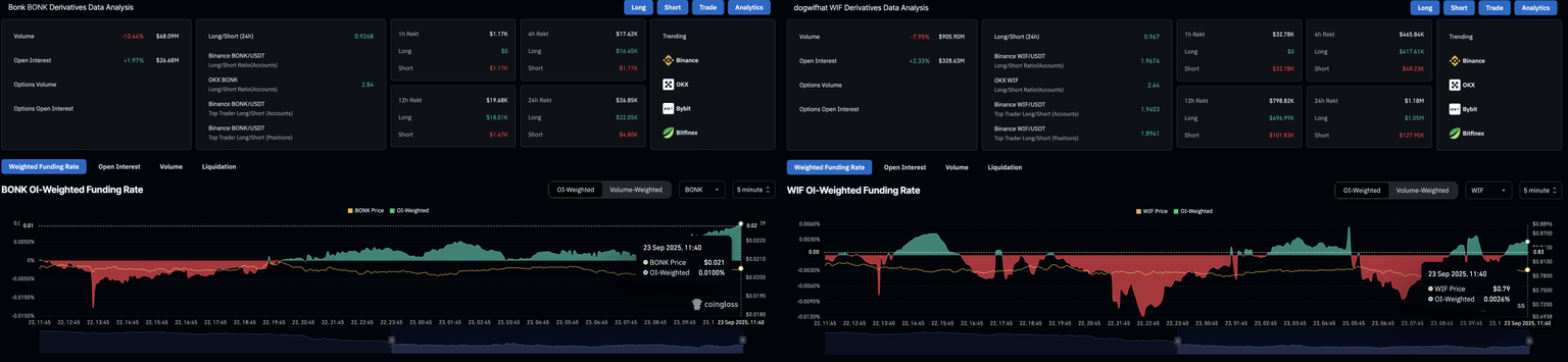 Sharp fluctuations in the derivatives data indicate a quick shift in traders’ sentiment. CoinGlass data shows that the Open Interest (OI) of BONK and WIF has increased by 1.97% and 2.33% over the last 24 hours, reaching $26.68 million and $328.63 million, respectively. This capital inflow indicates increased traders’ confidence in a potential reversal.