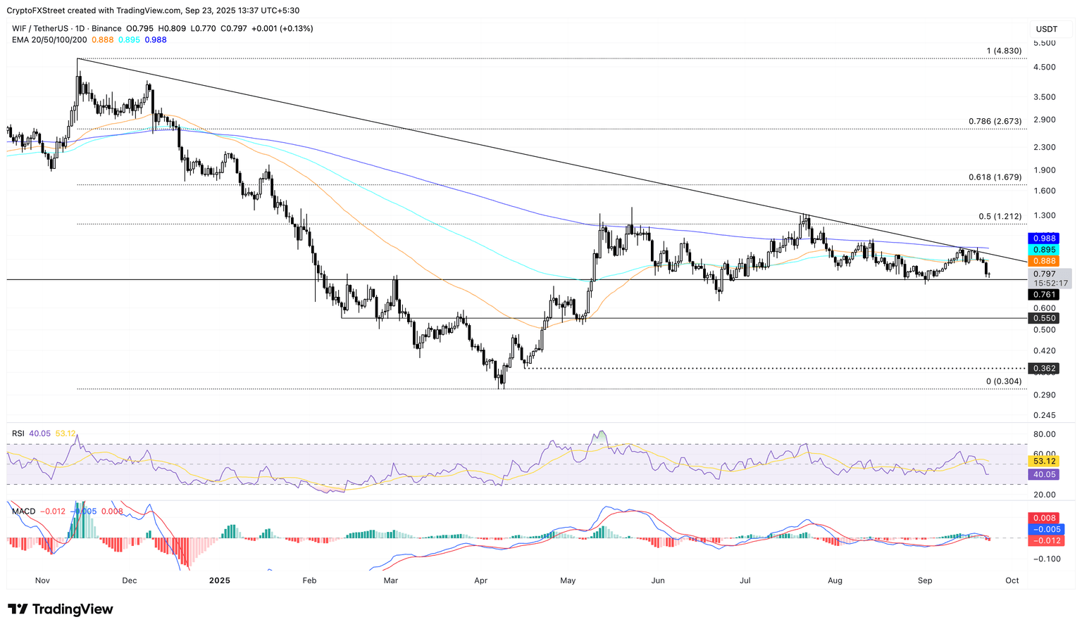 Dogwifhat trades above $0.790 at press time on Tuesday, recovering from the daily low of $0.770. The meme coin reversed from the 200-day EMA on Friday, marking four consecutive days of losses. At the time of writing, WIF holds above the $0.761 support level, which was last tested on September 2 and acts as a crucial crossroads.