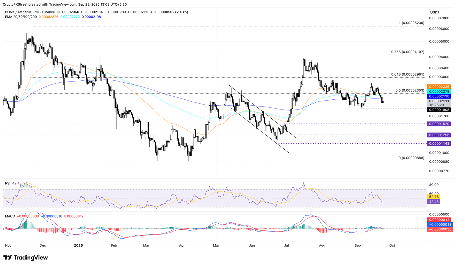 Bonk trades above $0.00002000 psychological level at the time of writing on Tuesday, following a four-day downfall that crossed below the 200-day Exponential Moving Average (EMA) at $0.00002198. BONK ticks higher by 2% so far on the day as bulls struggle to sustain dominance at this psychological support.