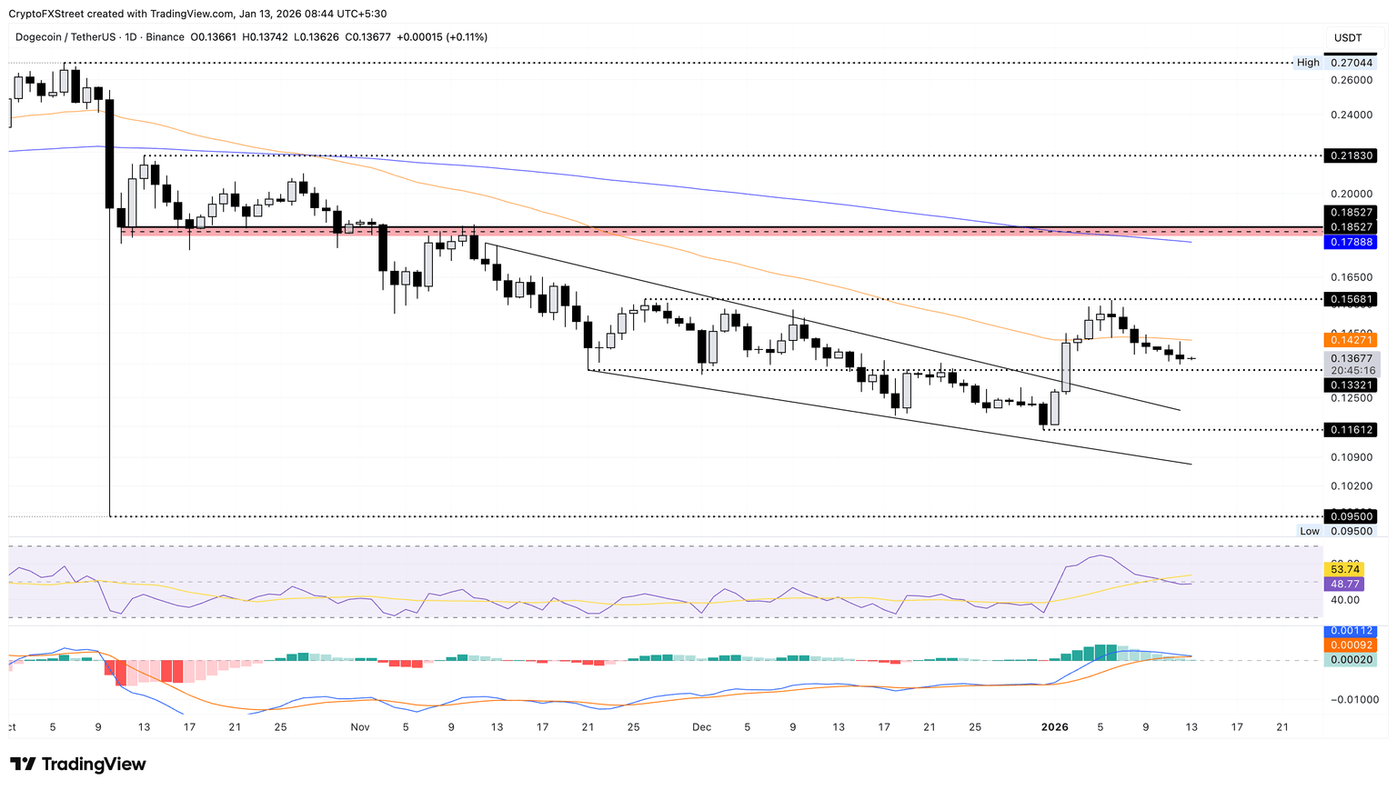 If DOGE slips below $0.1332, it could extend the decline to the December 31 low at $0.1161.
