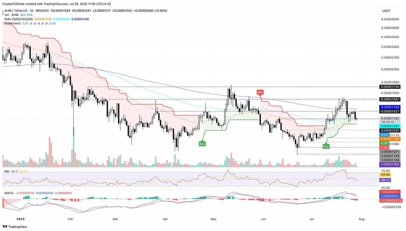 To reinforce an uptrend, Shiba Inu must reclaim the 200-day EMA at $0.00001449 to challenge the $0.00001567 resistance level last tested on July 22.