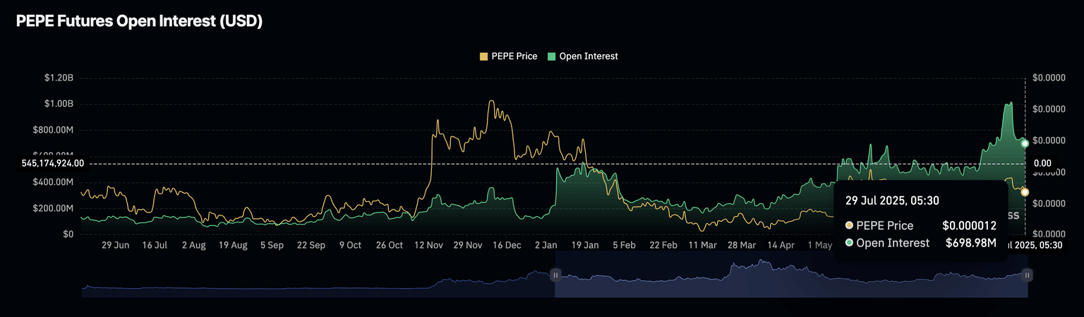 Similar to other meme coins, PEPE OI has dropped from its last week's peak of $1.02 billion to $698.98 million as of Tuesday. The loss of over $300 million highlights a significant capital outflow from PEPE derivatives as traders choose to sit on the sidelines and await a decisive trend.