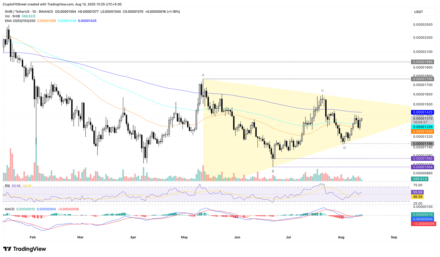 Shiba Inu ticks higher by around 3% at press time on Wednesday, following a 4.72% rise on Tuesday. The meme coin maintains an uptrend within a symmetrical triangle pattern on the daily chart (shared below).