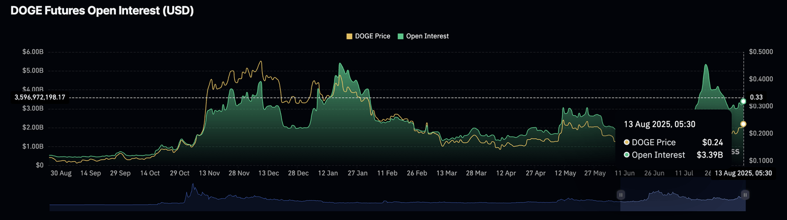 DOGE derivatives experience a surge in capital inflow as spot demand rises, resulting in an increase in Open Interest to $3.39 billion from $3.20 billion on Tuesday. The $190 million inflow reflects a significant increase in traders' interest, indicating anticipation of further recovery.