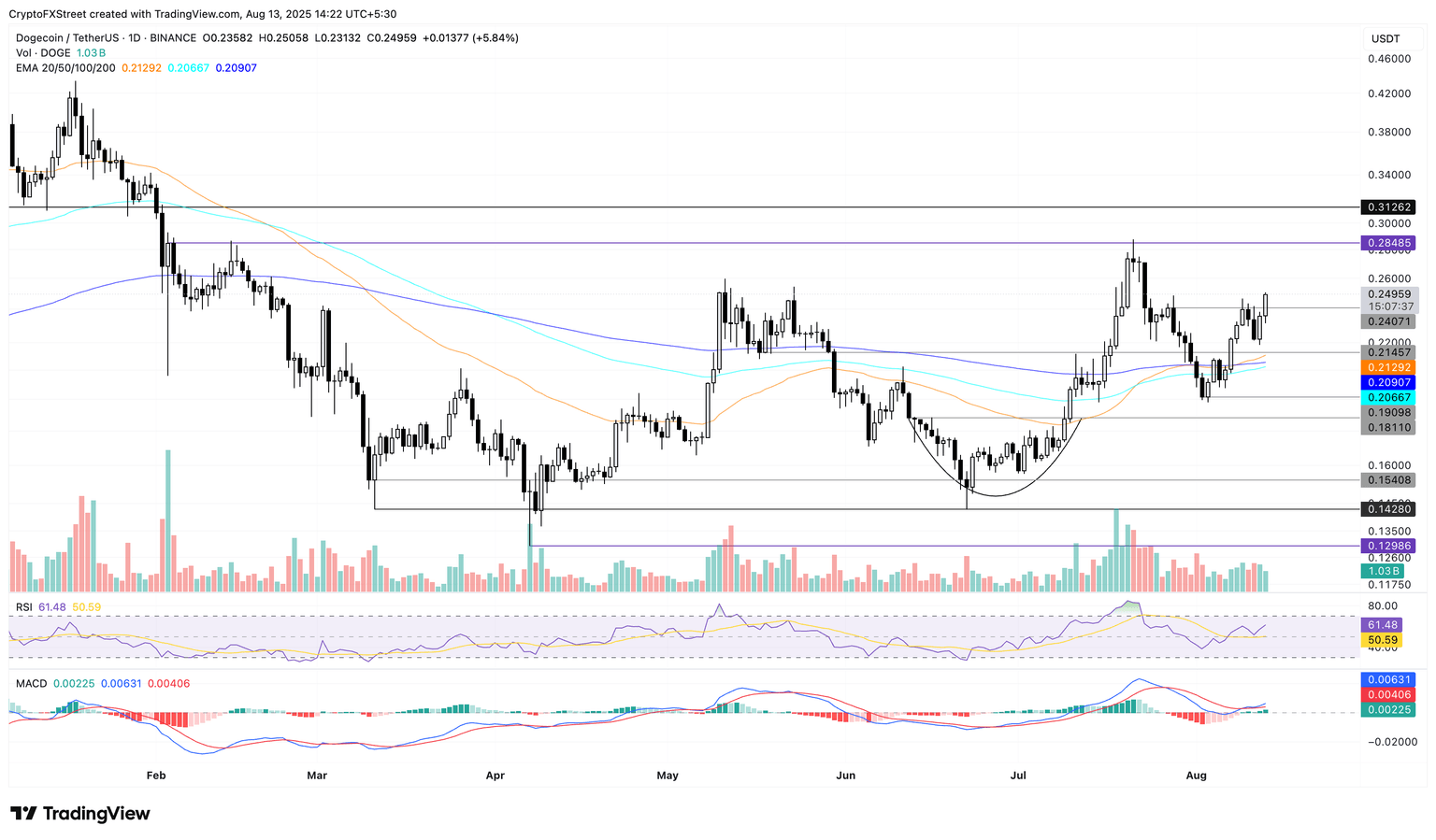 As the first-ever meme coin exceeds the $0.2407 weekly resistance, a decisive close above this level could extend the meme coin rally to the $0.2848 resistance, last tested on July 21.