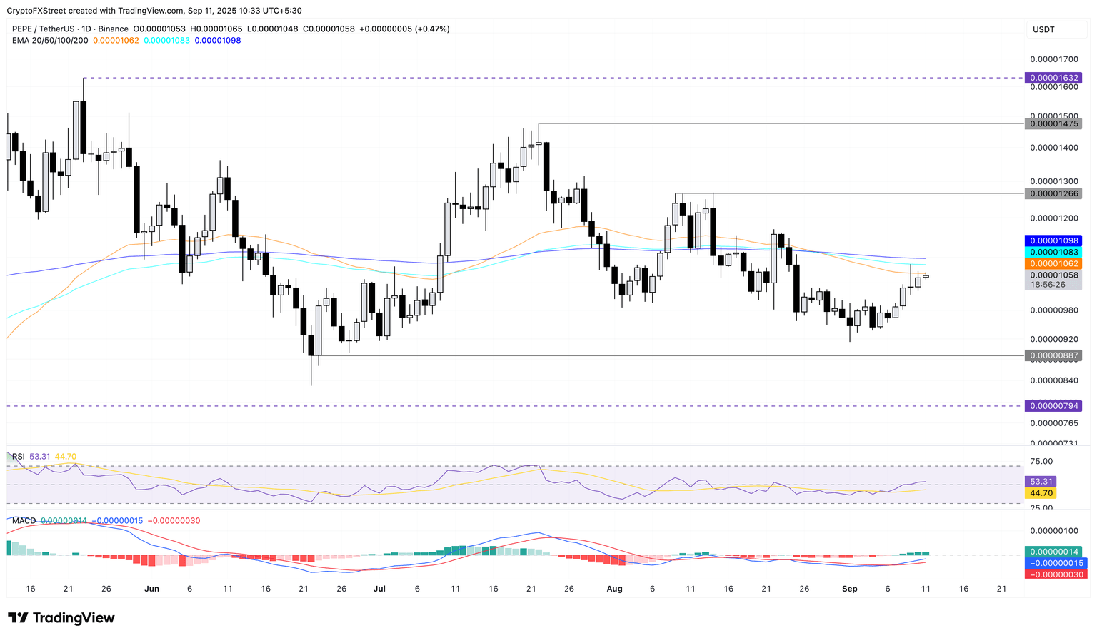 If PEPE clears above the 200-day EMA at $0.00001098, it could extend the recovery to the $0.00001266 level, last tested on August 14.