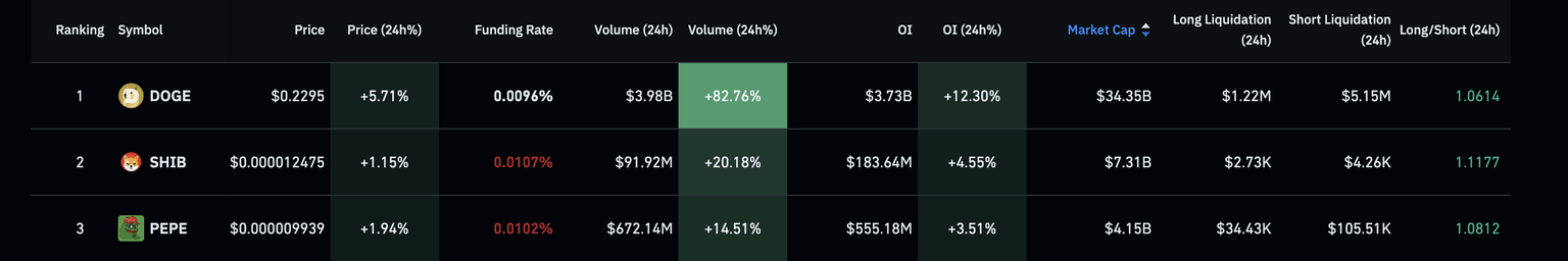 Notably, the long-to-short ratio over the last 24 hours is above 1 for these top meme coins, suggesting a bullish bias among traders.
