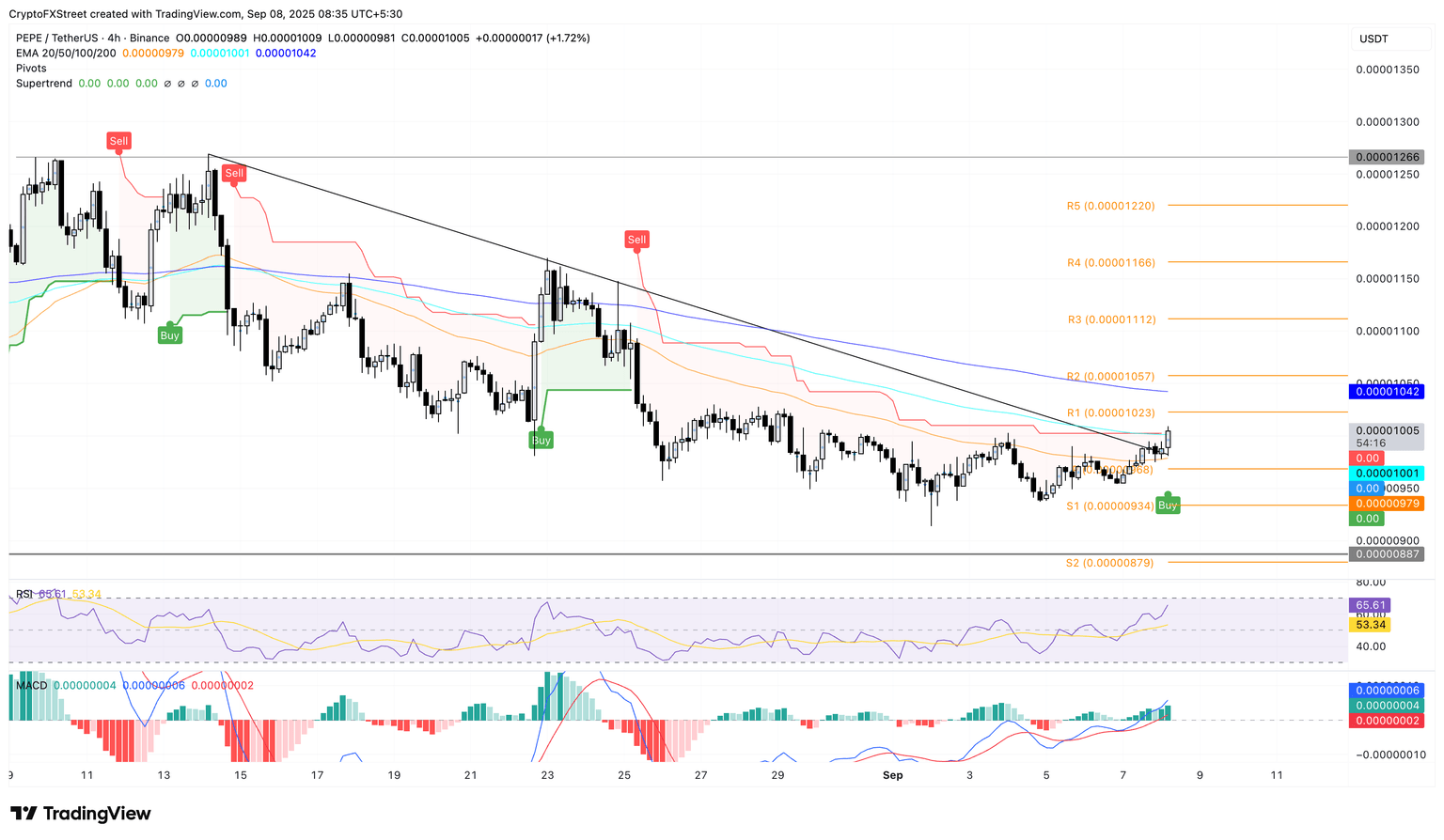 As Pepe reclaims a psychological level, the breakout rally targets the 200-period EMA at $0.00001042. An extended recovery could reach the R3 pivot level at $0.00001112.