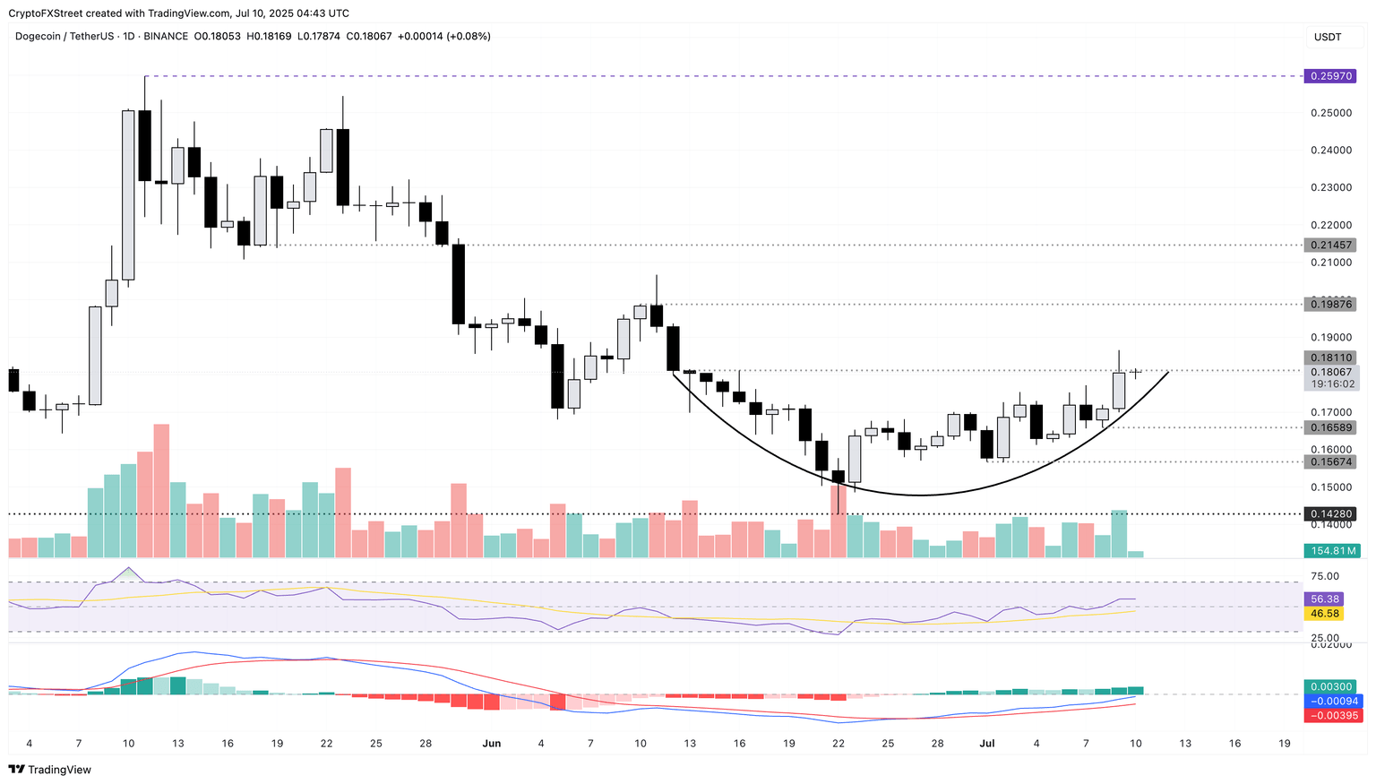 - Dogecoin trades in the green as it inches closer to a rounding bottom pattern breakout.