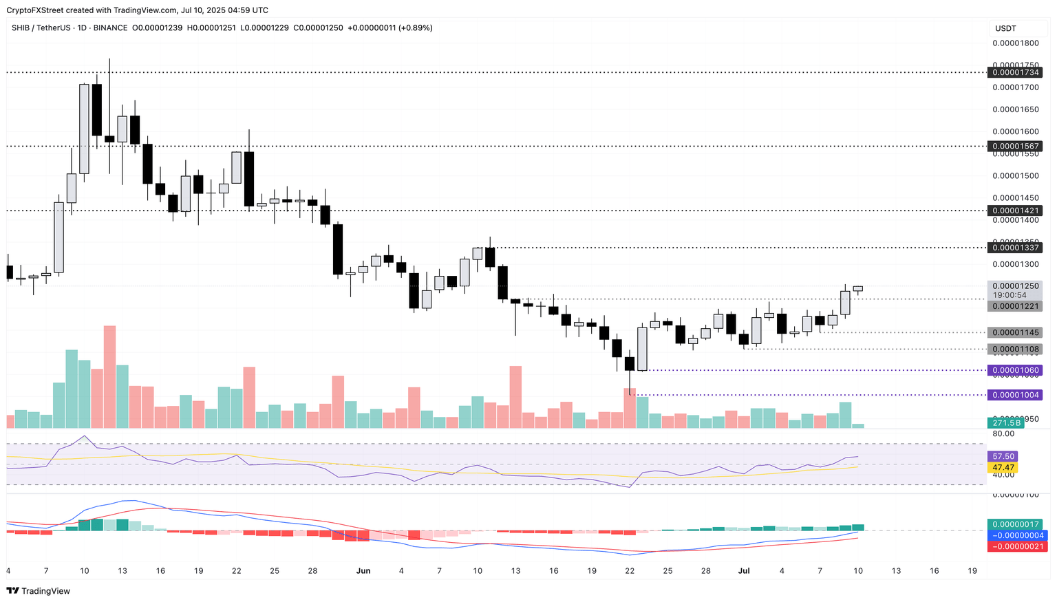 As the trend reversal in Shiba Inu gains traction, bulls target the immediate resistance at $0.00001337, marked by the June 10 high.