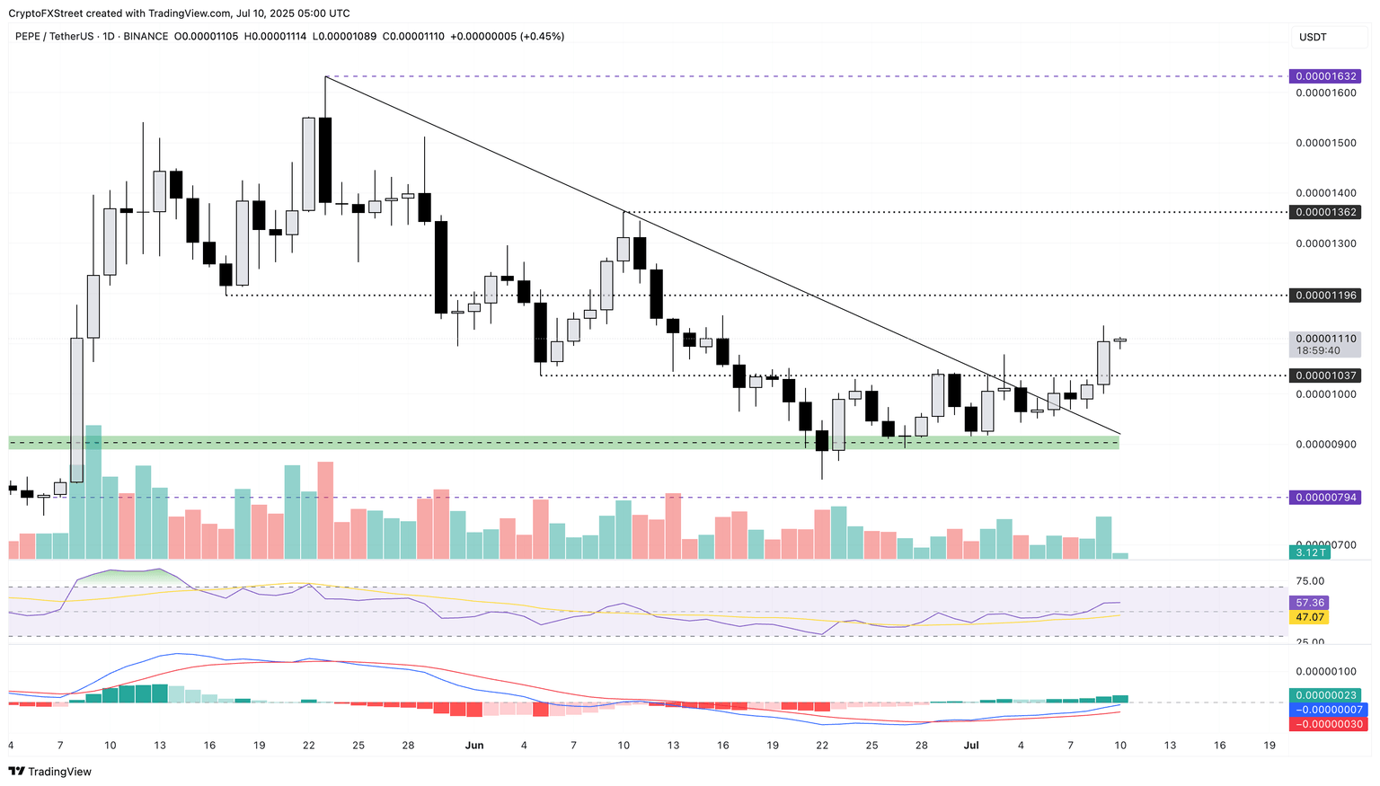 PEPE's breakout rally targets the $0.00001196 level marked by the May 17 low as the uptrend gains traction.