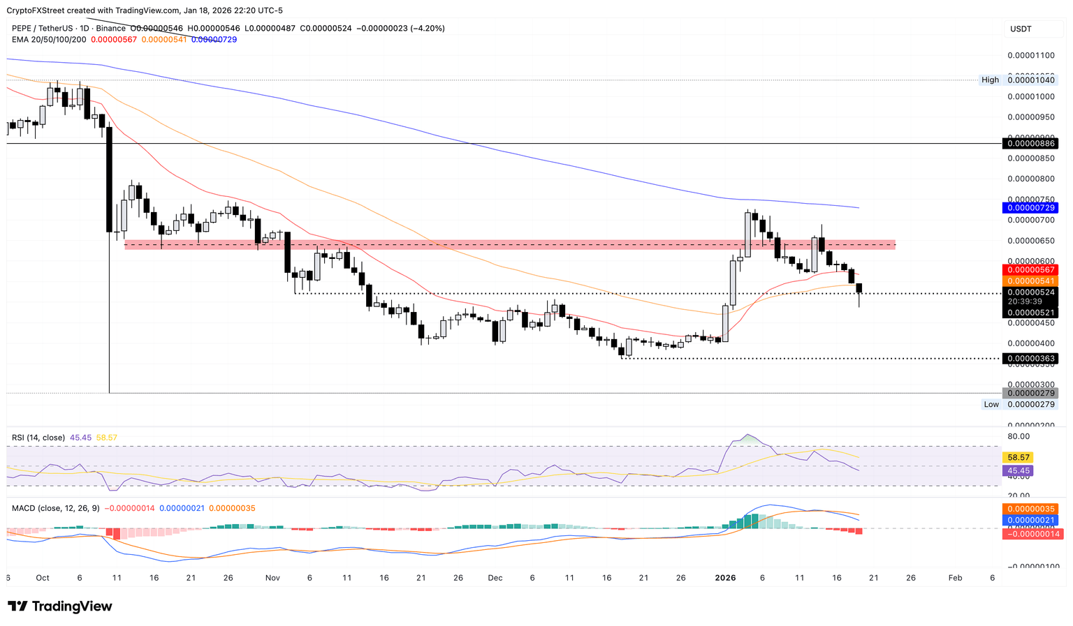 Pepe remains under extreme selling pressure, starting its third consecutive bearish week. At the time of writing, the frog-themed meme coin is down 4% on Monday, crossing below the 50-day EMA at $0.00000541.