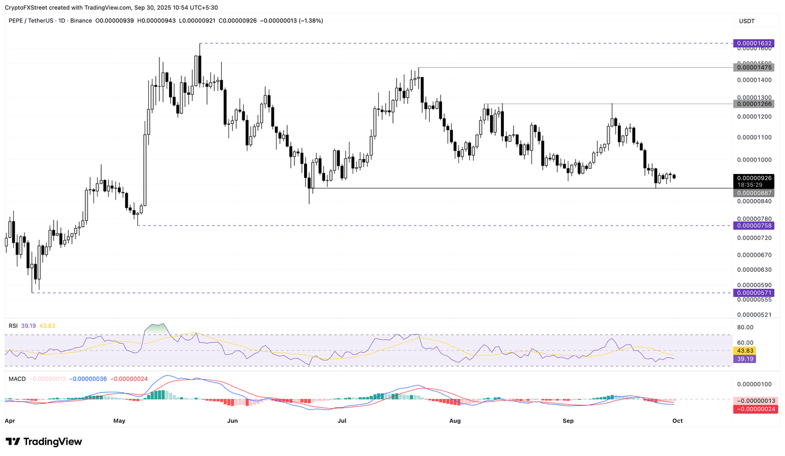 If PEPE rebounds above the $0.00001000 psychological level, it could test the $0.00001266 resistance level, last tested on September 13.