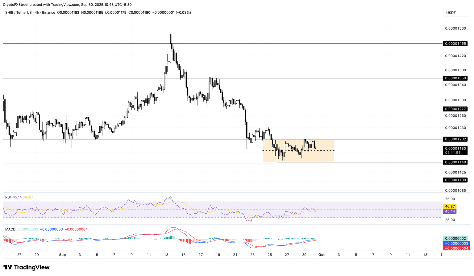 Shiba Inu edges lower by over 1% at press time on Tuesday, starting a downcycle within a consolidation range on the 4-hour chart. This range extends from the $0.00001202 upper boundary to the $0.00001148 support floor.