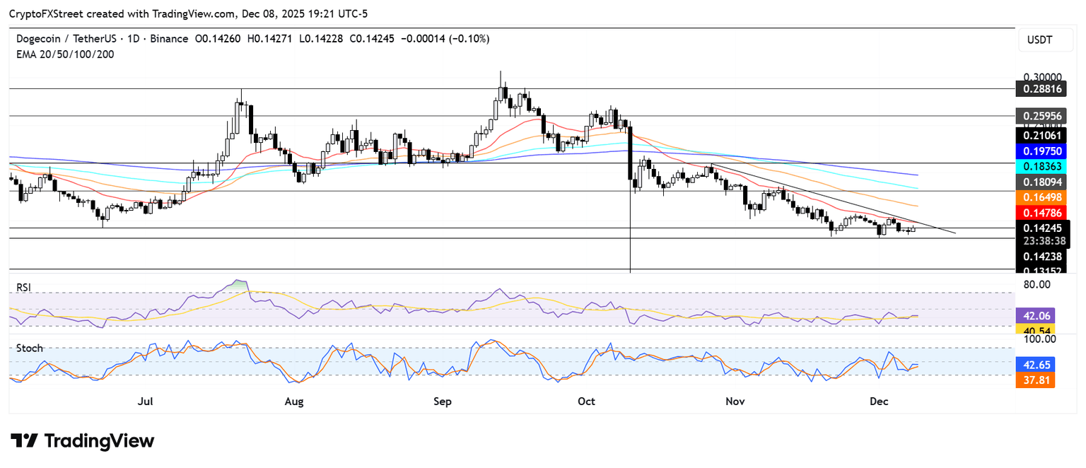 Dogecoin is looking to rise above the $0.142 level, but it faces a key descending trendline resistance extending from October 27. The resistance is strengthened by the 20-day Exponential Moving Average (EMA), which DOGE has failed to sustain a rise above since the October 10 crash.