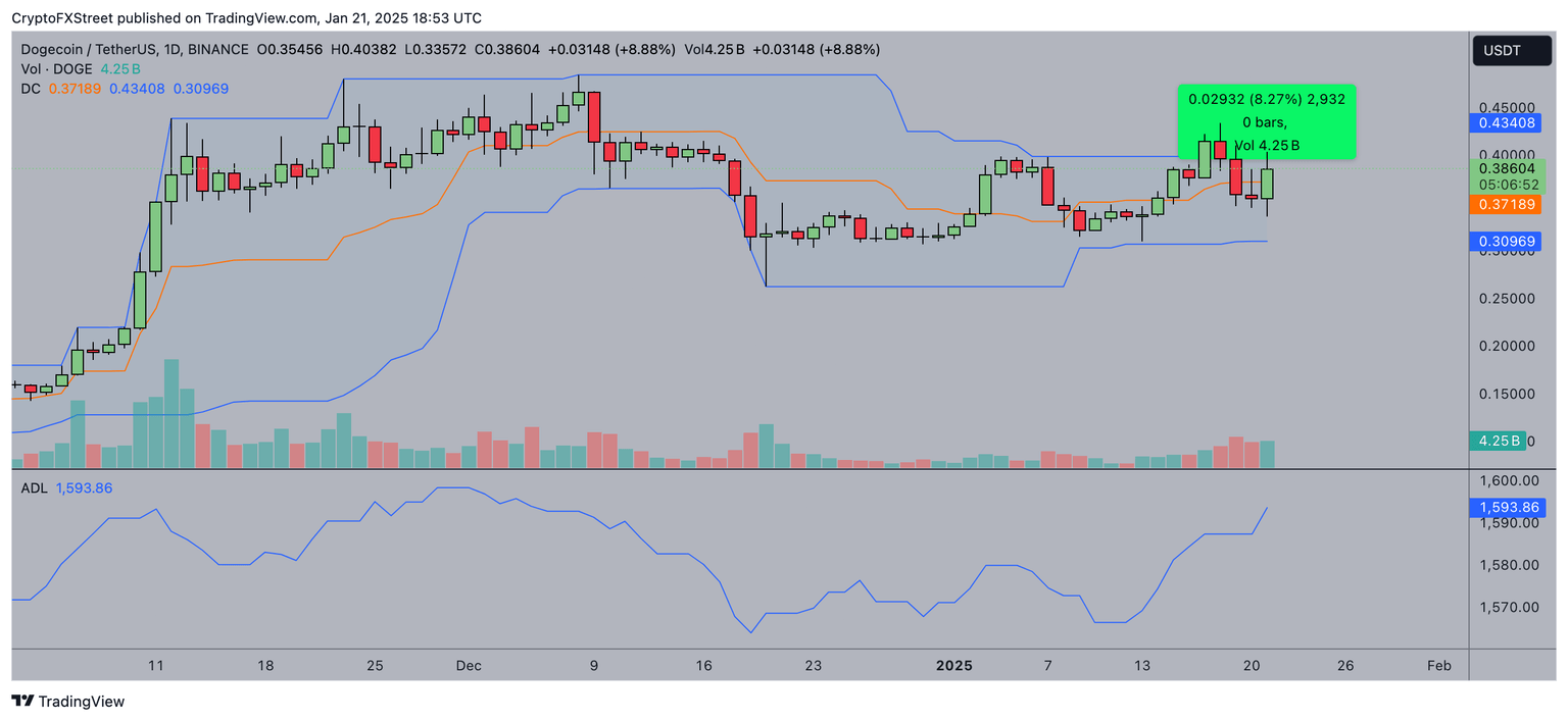 The chart illustrates DOGE reclaiming the middle Donchian Channel (DC) boundary at $0.3718, signaling growing optimism.