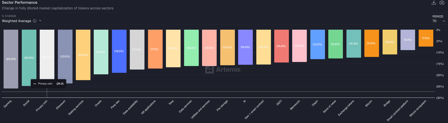 Privacy coins remain under pressure so far this week, diverging from the minor relief seen in the broader cryptocurrency market as Bitcoin (BTC) resurfaces above $75,000. Artemis data show that the privacy segment has declined by 24% over the last week, making it one of the worst-performing sectors after gaming and social tokens.