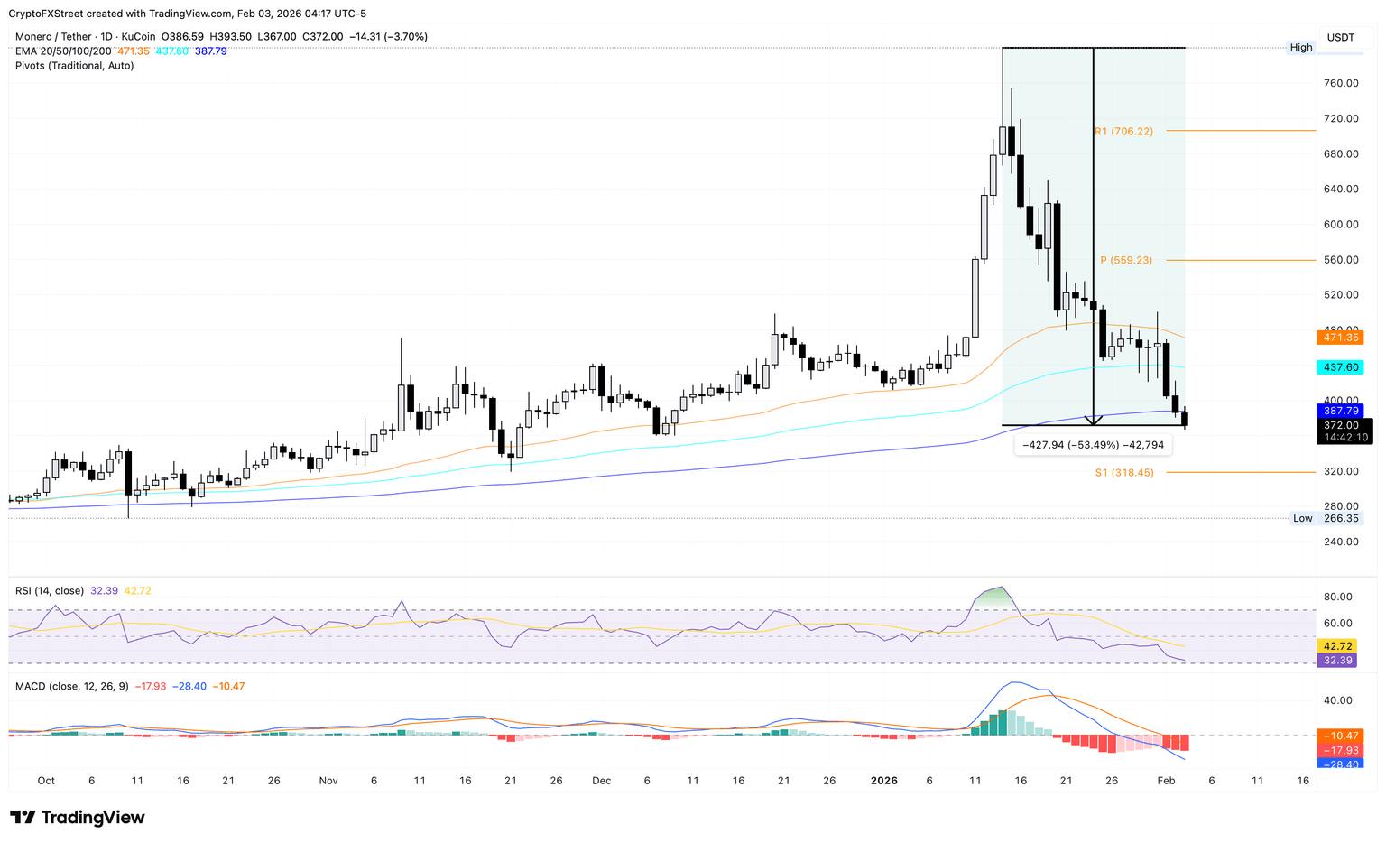 Monero has fallen below the $400 mark from its $800 peak on January 14, representing more than a 50% decline. At the time of writing on Tuesday, XMR is down 4% on the day, trading below its 200-day EMA at $387, and amounting to a roughly 20% decline over the last three days.