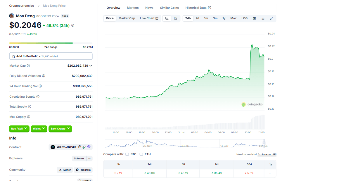 Moo Deng (MOODENG), a Solana-based meme coin, has surged more than 40% in the last 24 hours and trades around $0.204 at the time of writing on Thursday. The main reason for this ongoing rally is the announcement by the Upbit Korea exchange to provide trading support for the hippo-themed token. The meme coin quickly gained traction, pushing its market capitalization over $217 million and surpassing other popular meme coins, such as Neiro (NEIRO) and Baby Doge Coin (BABYDOGE).