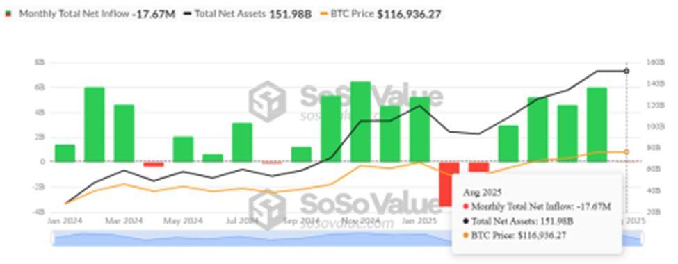 SoSoValue data shows July’s BTC ETF netflow exceeded $6 billion—the highest since last December. However, netflows had turned negative by mid-August, with outflows of more than $17 million.