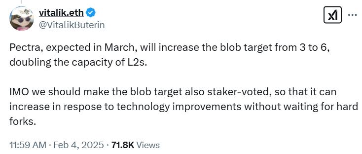 After the success of the vote, Ethereum co-founder Vitalik Buterin is calling for the Pectra fork, which is expected in March and will increase the blob target from three to six. Pectra will also be staker-voted, using the “same mechanism as the gas limit,” Buterin said.