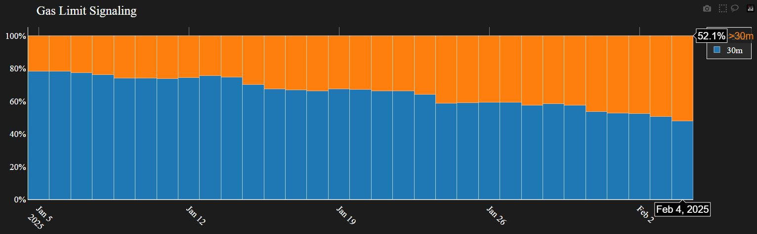 As of Feb. 4, Gaslimit.pics, which actively tracks the progress of validators’ support for a higher gas limit, shows 52% of validators are in favor, surpassing the threshold requiring at least half to agree to scale the layer 1 network.