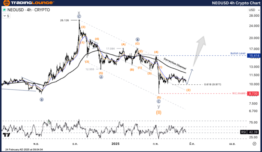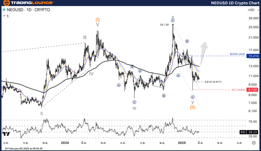 NEO/USD is currently in a corrective Wave II phase after completing Impulse Wave I at a peak of 26.126 USD. The correction is identified as a W-X-Y (Double Zigzag) structure, indicating an intricate corrective pattern.