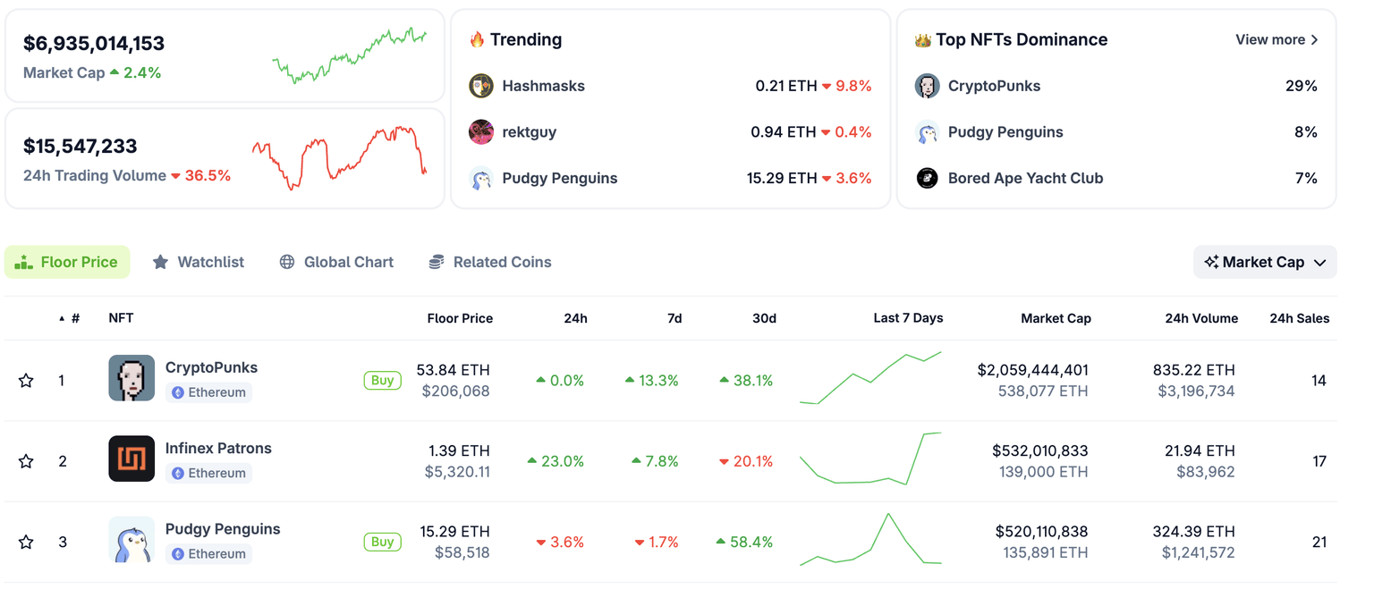 CoinGecko data shows a surge of over 2% in NFT market capitalization over the last 24 hours, reaching $6.93 billion, indicating a renewed interest from investors. However, the trading volume is down 36% during the same period, at $15.54 million, indicating a short-term cooldown.