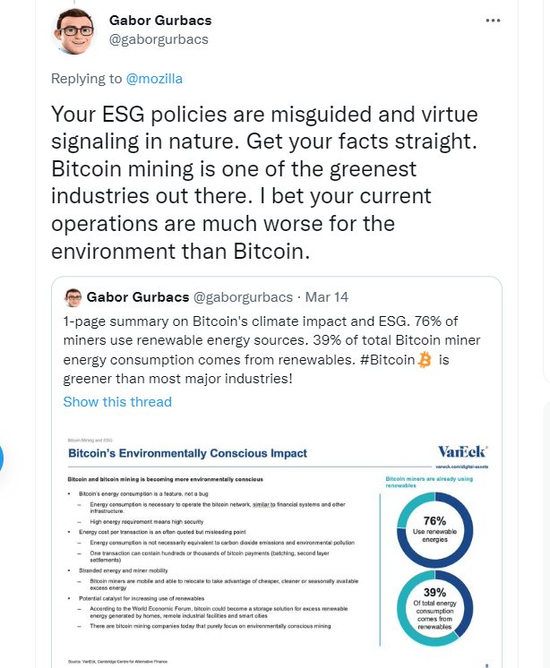Director of Digital Strategy at American investment firm VanEck Gabor Gurbacs had harsh criticism for Mozilla’s decision to block Bitcoin donations. In an Apr 12 tweet, he called the move “misguided and virtue signaling in nature,” adding that “Bitcoin is one of the greenest industries out there.”