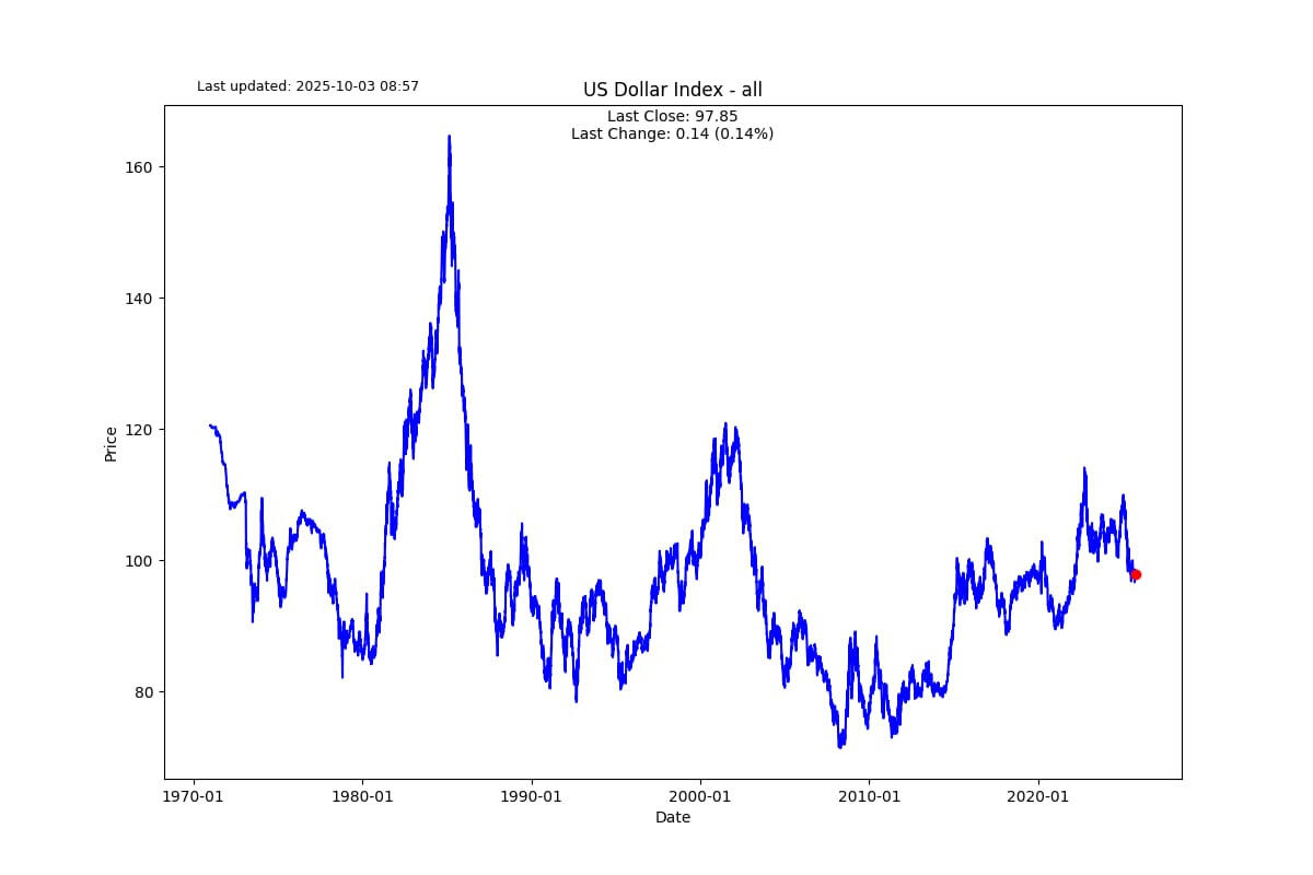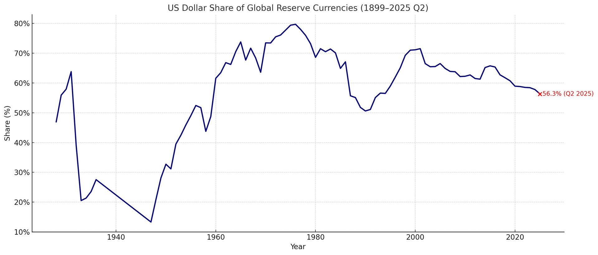 I did some serious scraping of data to add a lot of history to the short data release from the IMF showing the current (Q2: 2025) % US dollar share of global reserve currencies. It’s at recent multi-decade lows, but I wanted to bring in more history to give you a perspective that it has been much lower and has recovered.