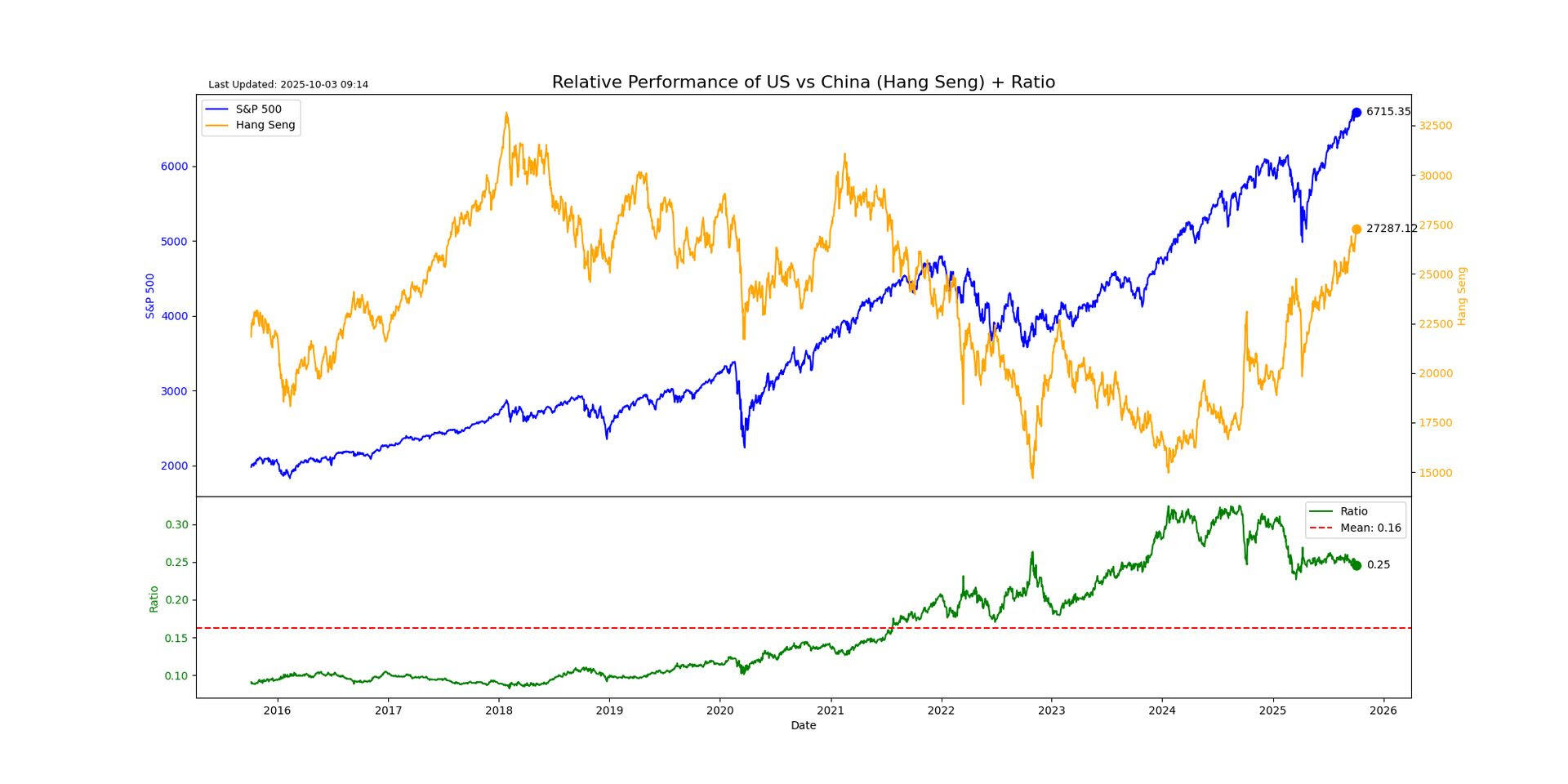Just a quick update on my long China (via Hang Seng) and short US: the trade continues to remain profitable. I am anticipating the trade will make new profit highs or ratio lows once the S&P 500 is firmly in correction mode. In other words, I am anticipating China being more defensive.
