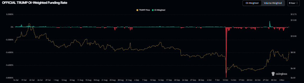 Derivatives data also support a bullish bias. Coinglass’s OI-Weighted Funding Rate data shows that the number of traders betting that the price of TRUMP memecoin will slide further is lower than those anticipating a price increase.