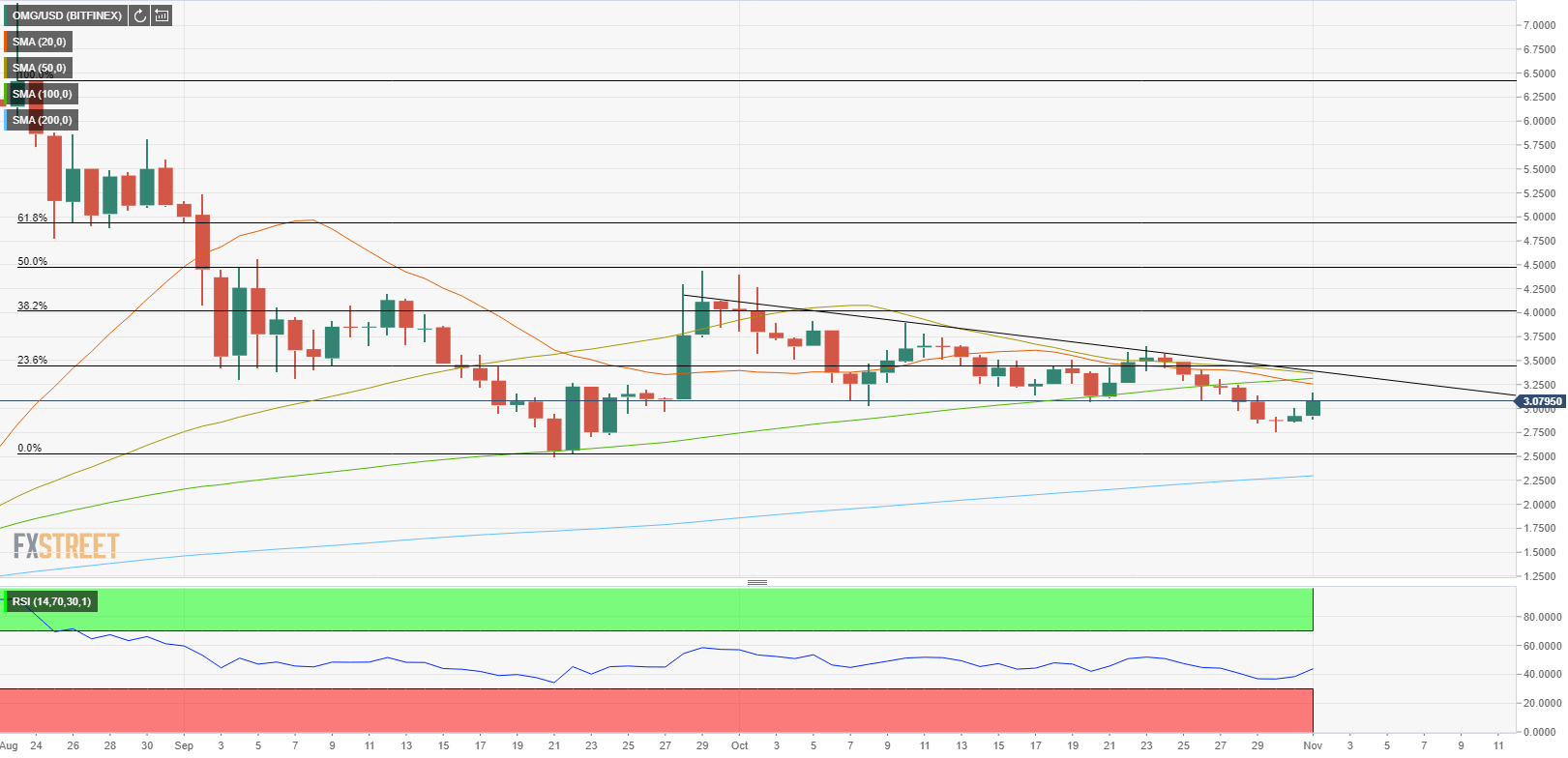 With this recent rebound, OMG is closing in on a cluster of critical resistances. The 20-day, 50-day and the 100-day SMAs are sitting around $3.40. Additionally, the descending resistance line coming from late September and the 23.6% Fibonacci retracement of the September downtrend are also located in that area. If OMG manages to break above that area and closes there, it could target $4 (psychological level/Fibonacci 38.2% retracement).