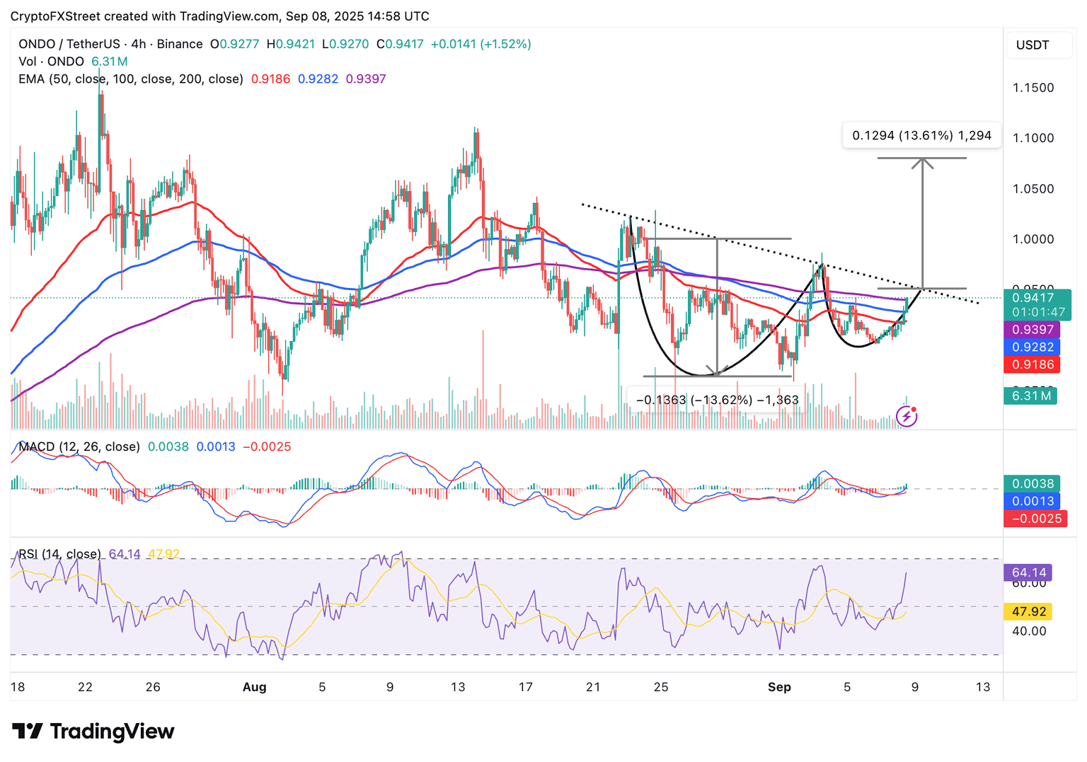 Ondo holds above the 100-period Exponential Moving Average (EMA) at $0.92 on the 4-hour chart. At the same time, bulls are pushing to break the 200-period EMA resistance at $0.93 to pave the way for a Cup and Handle pattern breakout.