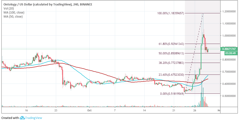 At the time of writing ONT/USD is exchanging hands at $0.8857 after correcting lower 13% in the last 24 hours. The lower correction has found support at the 50% Fib level. The buyers are keen on the recovery the value slashed and possibly correct above the monthly high.