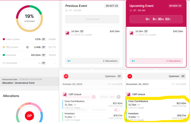 - Optimism network will be unlocking 24.16 million OP tokens, constituting 2.74% of total supply, on November 30.