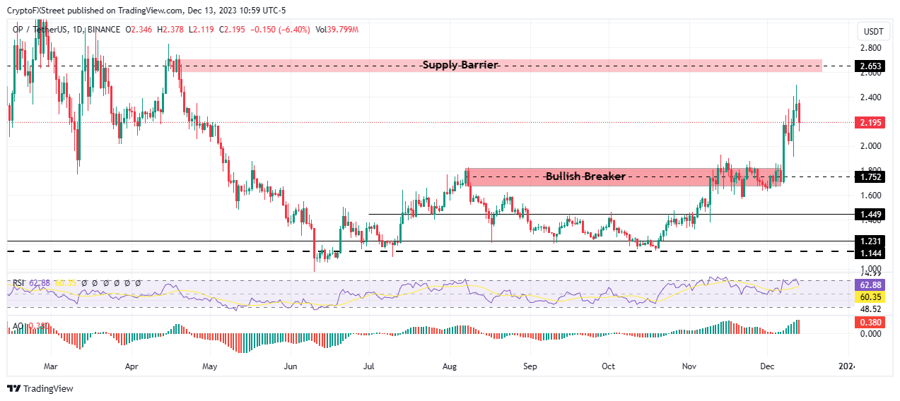 Optimism price remains bullish despite the 10% correction, considering the Relative Strength Index (RSI) remains above the 50 level. The Awesome Oscillator (AO) also accentuates the bullish outlook as it remains within positive territory.