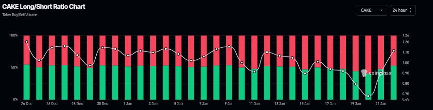 Coinglass’s OI-Weighted Funding Rate data shows that the number of traders betting that the price of CAKE will slide further is lower than that anticipating a price increase. Generally, a positive rate (longs pay shorts) indicates bullish sentiment, while negative numbers (shorts pay longs) indicate bearishness.