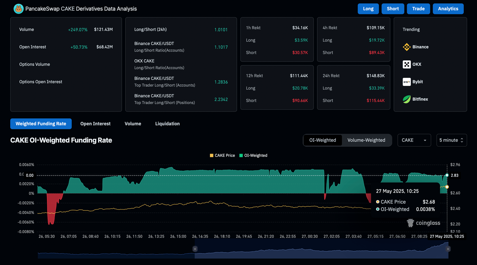 Amid the positive technical outlook, Coinglass derivatives data showcase rising traders’ interest in CAKE. The open interest (OI) is up by 50% in the last 24 hours, reaching $68.42 million alongside the OI-weighted at 0.0038%, reflecting the traders' growing bullish intent.