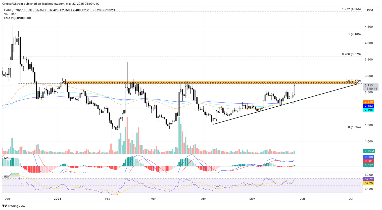 From a technical perspective, PancakeSwap teases a bullish engulfing candle on the daily chart and challenges the $2.77 supply zone, a crucial resistance that has resulted in multiple breakout failures in the first quarter.