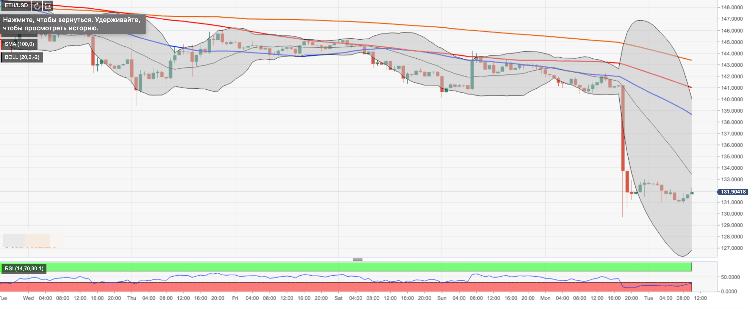 ETH/USD is changing hands at $131.91. The coin has recovered from Monday's low of $129.71, though, though it is still below the initial recovery target created by SMA50 (Simple Moving Average) 1-hour at $138.65. We will need to see a sustainable move above this handle for the upside to gain traction with the next focus on psychological $140.00 reinforced by the upper line of 1-hour Bollinger Band. The next barrier is created by SMA100 1-hour at $141.00.