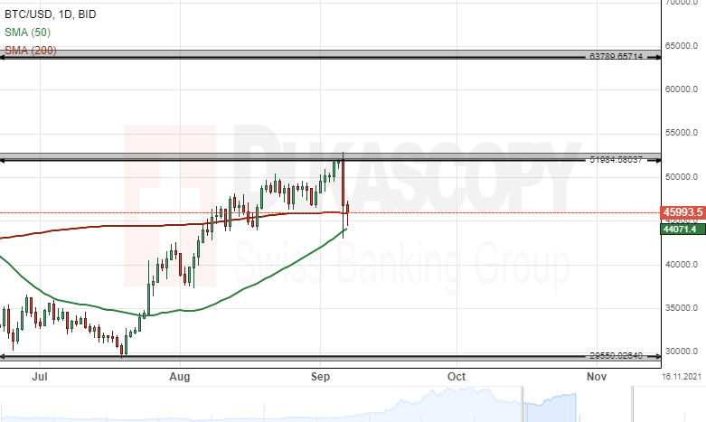 The Bitcoin cryptocurrency has declined by 15.24% against the US Dollar since this week's trading sessions. The decline was stopped by the 200– day simple moving average at 45854.9 on September 7.